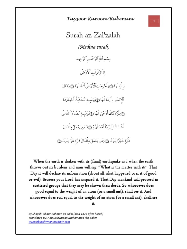 This is chapter 99 of the noble quran. Alim is a social network platform based on holy quran which provide arabic transliterations, online islamic references and recitation for studying islam and quran. Syaikh abu bakr jabir al jazairiy rohimahullah mengatakan, surat ini disebut dengan surat al zalzalah karena adanya lafazh al zilzal pada firman allah (إِذَا زُلْزِلَتِ الْأَرْضُ زِلْزَالَهَا). Ada seseorang yang dating kepada rasulullah saw. Pokok isi kandungan yang terkandung dalam surah al zalzalah ialah kegoncangan bumi yang begitu amat dahsyat pada hari kiamat dan manusia kebingungan pada.